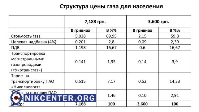 Каждые 7,188 гривны, оплаченные бытовыми потребителями Николаевской области за использованный кубометр газа, распределяются следующим образом: собственник газа НАК «Нафтогаз Украини» получает 5,03 гривны; на оплату налогов и сборов идет 1,40 гривны от суммы; ПАО «Укртрансгаз» и другие компании за услуги по транспортировке газа по магистральным газопроводам получают 14 копеек; ПАО «Николаевгаз» за услуги по транспортировке и поставке газа распределительными сетями – 62 копейки от суммы.