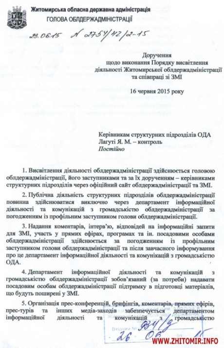 Публичная деятельность департаментов ОГА "должна осуществляться исключительно через департамент инфордеятельности и коммуникаций с общественностью ОГА по согласованию с профильным заместителем председателя ОГА".