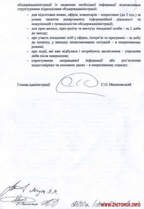 Председатель Житомирской ОГА Сергей Машковский запретил чиновникам администрации давать комментарии прессе без согласования со специальным департаментом.