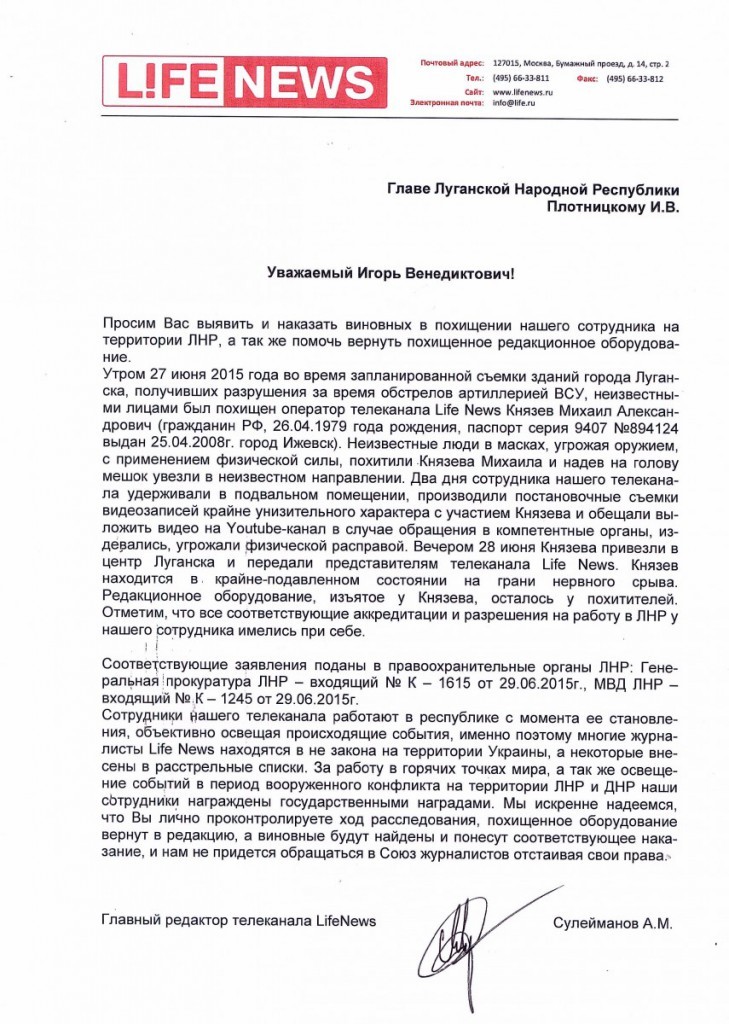 Оператор телеканала LifeNews Михаил Князев 27 июня был похищен неизвестными вооруженными лицами в центре Луганска. Как сообщает в письме к главе «ЛНР» Игорю Плотницкому главный редактор телеканала LifeNews Анатолий Сулейманов, в течение двух дней неизвестные похитители издевались и морально унижали похищенного оператора.