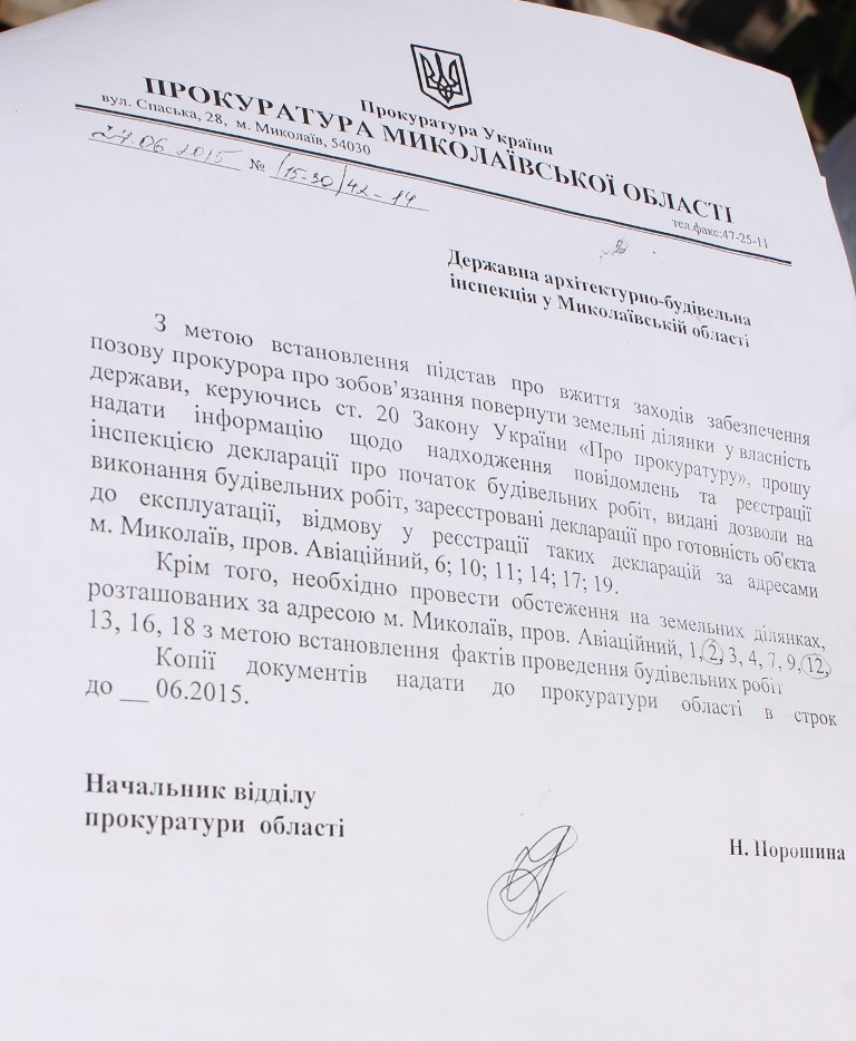 Как сообщил инспектор инспекторского отдела в Николаеве управления Государственной архитектурно-строительной инспекции Украины Николай Марштупа, владелец 12-го участка ещё год назад получил разрешение на проведение строительных работ.