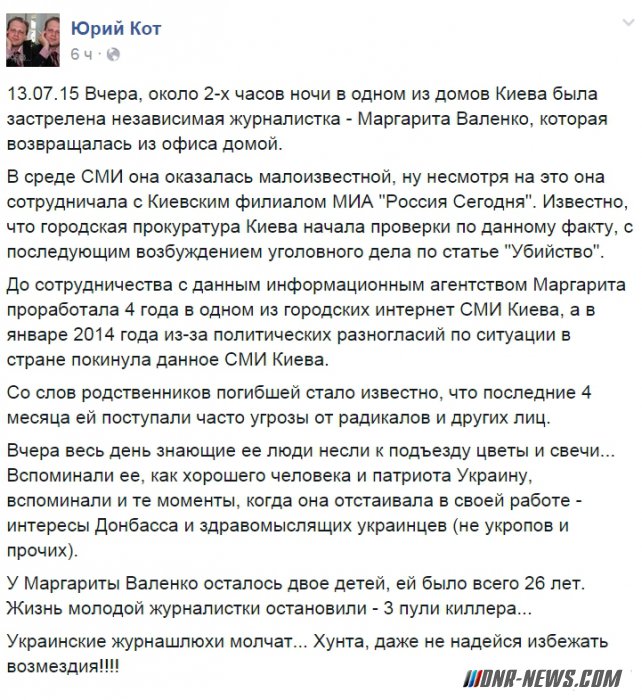 Во вторник около полудня стало известно, что в Киеве накануне была застрелена независимая журналистка Маргарита Валенко, которая возвращалась из офиса домой. У Маргариты Валенко осталось двое детей. Ей было всего 26 лет. Об этом на своей странице в Facebook сообщил общественный деятель Юрий Кот, который также известен как ведущий "Антимайдана".