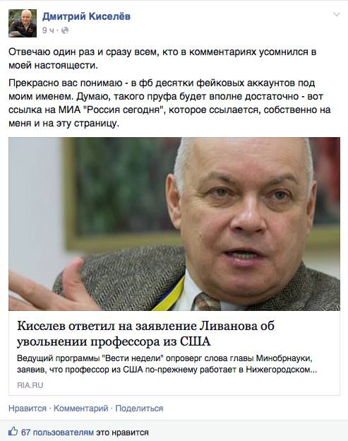 Фейсбук-аккаунт Киселева продержался считанные часы — закрыли после сотен насмешек.