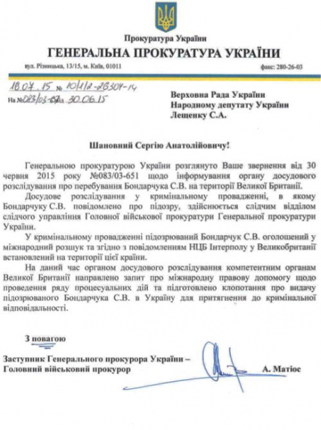 "Согласно сообщению НЦБ Интерпола в Великобритании (Бондарчук – ред.) установлен на территории этой страны", — заявили в ГПУ.