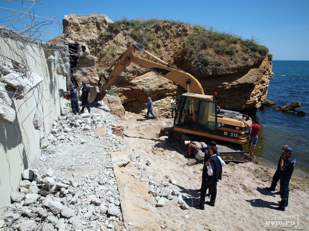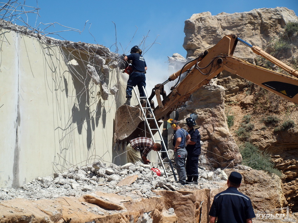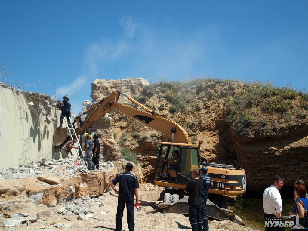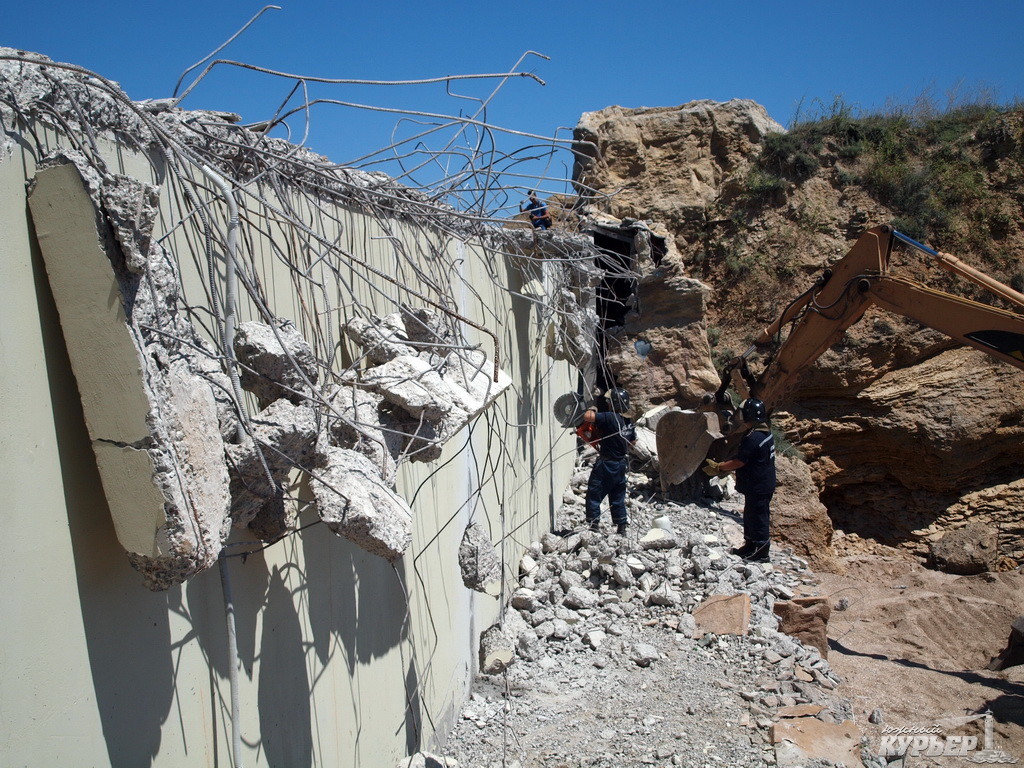 После некоторых усилий северная стена рухнула. До сегодняшнего вечера спасатели расчистят образовавшийся вдоль моря проход от завалов и, таким образом, проход от мини-пляжа для нудистов в скалах к пляжу депутатской резиденции уже завтра утром будет открыт. Завтра же будет снесена и южная часть стены, преграждающая проход вдоль моря в сторону Чкаловского пляжа.