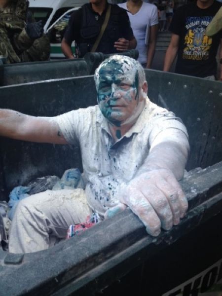 Депутата Одесского горсовета, руководителя регионального отделения Фонда Госимущества, известного апологета «русского мира» Алексея Косьмина активисты «Евромайдана» люстрировали через мусорный бак.