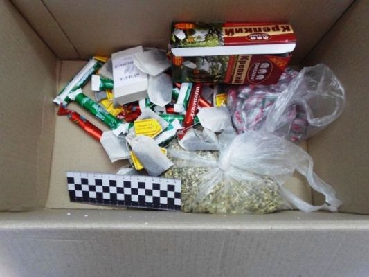 Во время досмотра содержимого посылки сотрудники изъяли завернутое в этикету от конфеты «Барбарис» вещество темно-зеленого цвета растительного происхождения и в пачке чая «Крепкий» был найден мобильный телефон Самсунг без батареи и СИМ-карты.