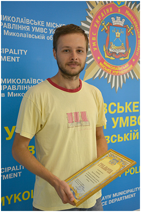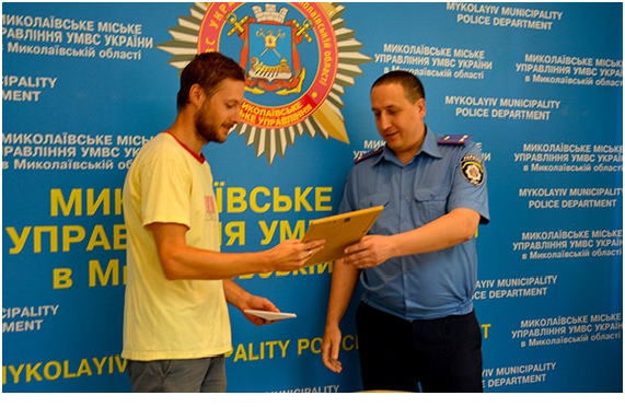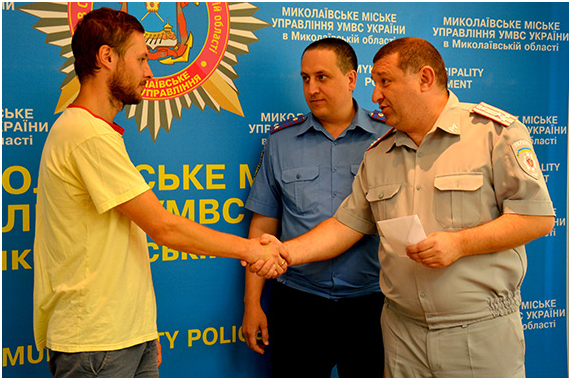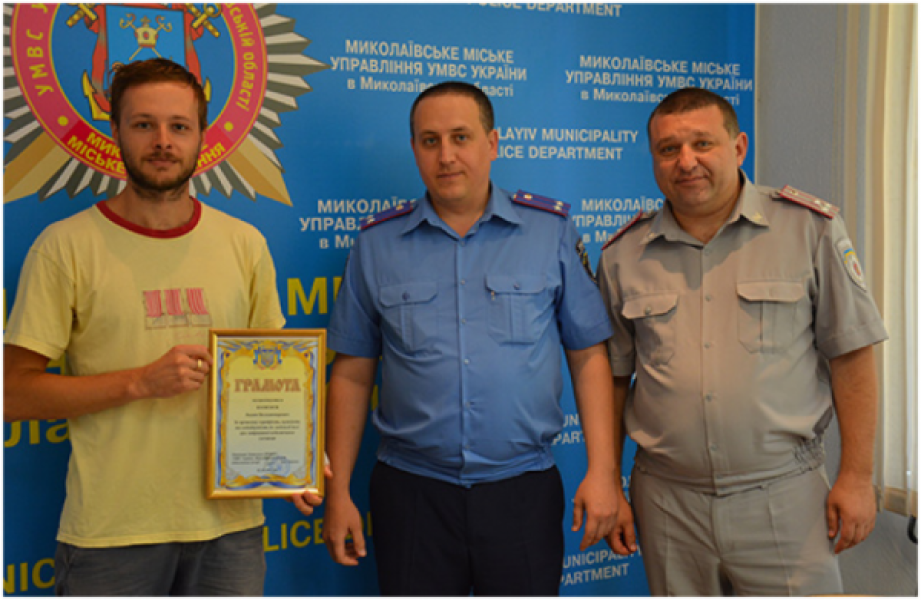 За помощь ОВД в раскрытии уличного преступления, неравнодушие и активную гражданскую позицию, начальник Николаевского городского управления милиции Артур Гаспаров и начальник Ленинского райотдела милиции Александр Гринчук вручили грамоту и денежную премию жителю Николаева — Вадиму Каменеву.