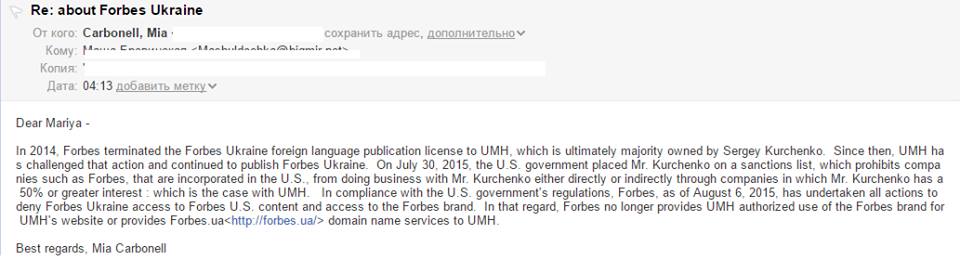 "Согласно распоряжению правительства США, Forbes по состоянию на 6 августа предпринял все меры, чтобы отказать Forbes Украина в доступе к контенту и бренду. В связи с этим, Forbes более не предоставляет UMH Group авторизованный доступ к бренду Forbes для сайта UMH, а также доступ к домену forbes.ua", — отмечается в сообщении Карбонелл.