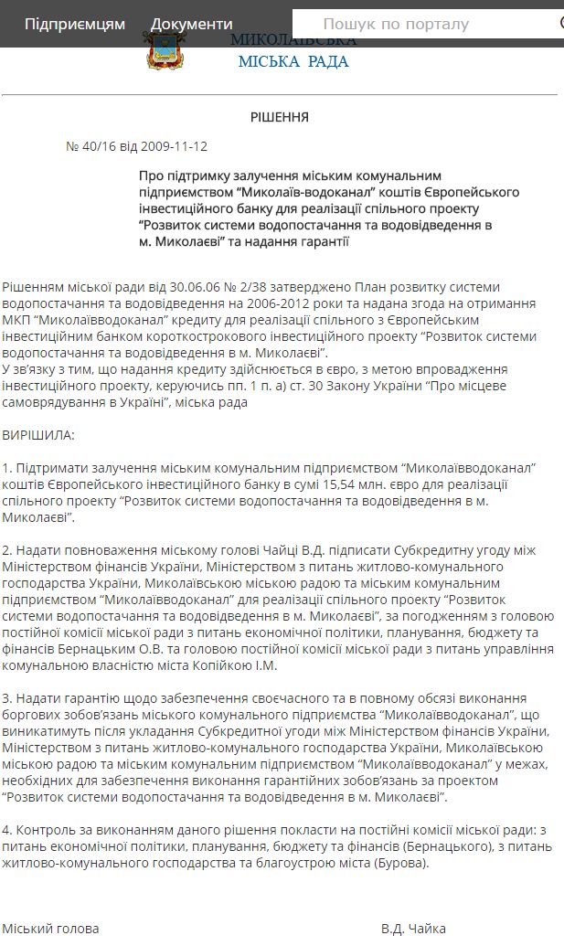Еще в 2009 году «Николаевводоканал» получил согласие от горсовета на получение от Европейского инвестиционного банка субкредита в размере в 15,5 млн. евро и гранта на 3,5 млн. евро от Европейской комиссии.
