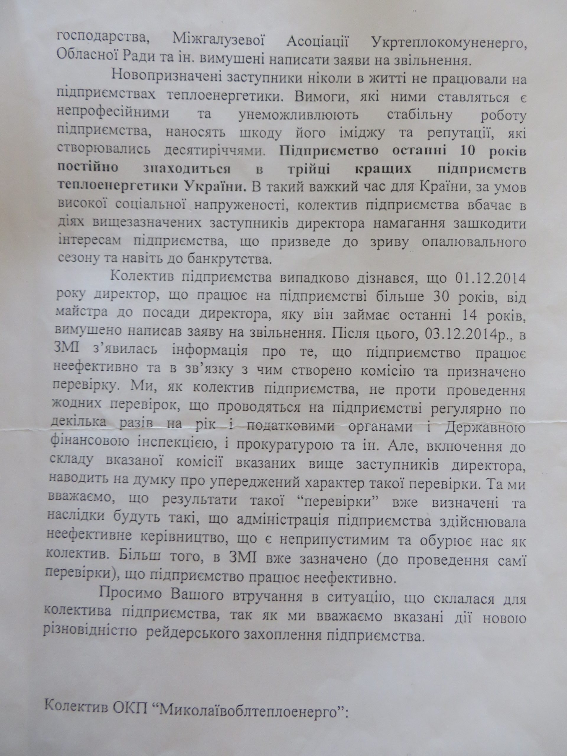 Люди возмутились. Жалобы о дестабилизации и нервной обстановке в ОКП «Николаевоблтеплоэнерго» полетели в Администрацию Президента Украины, Кабинет Министров, Министерство жилищно-коммунального хозяйства, межотраслевую ассоциацию «Укртеплокоммунэнерго». О своем категорическом несогласии работать на таких условиях Владимир Березницкий лично написал губернатору Вадиму Мерикову.
