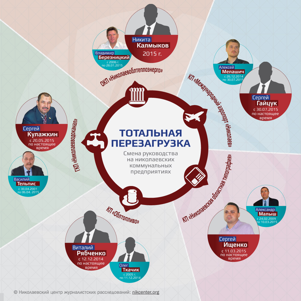 От наблюдательного взгляда журналистов не могло пройти то, что за последние полтора года в Николаеве произошла настоящая «кадровая революция» на коммунальных предприятиях. Из 11 объектов областной коммунальной собственности появились новые заместители и сменились руководители на пяти из них: в КП «Николаевская областная типография», ПАО «Николаевоблтеплоэнерго», КП «Облтопливо», КП «Международный аэропорт «Николаев», в КП «Профилактическая дезинфекция». К этому списку можно добавить и городское КП «Николаевводоканал».