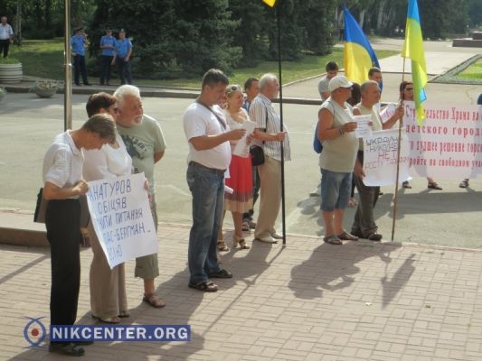 Сегодня, 12 августа, в Николаеве перед заседанием 49-й сессии горсовета общественники устроили сразу три акции протеста. Одна группа протестовала против незаконно возведенного здания на остановке "Рынок "Колос", недалеко от зоопарка, который значится по адресу: ул. Леонтовича, 7. Застройку вело ООО "МАР-1", принадлежащее скандально известным предпринимателям Алексею Пелипасу, Сергею и Ирине Бергманам.