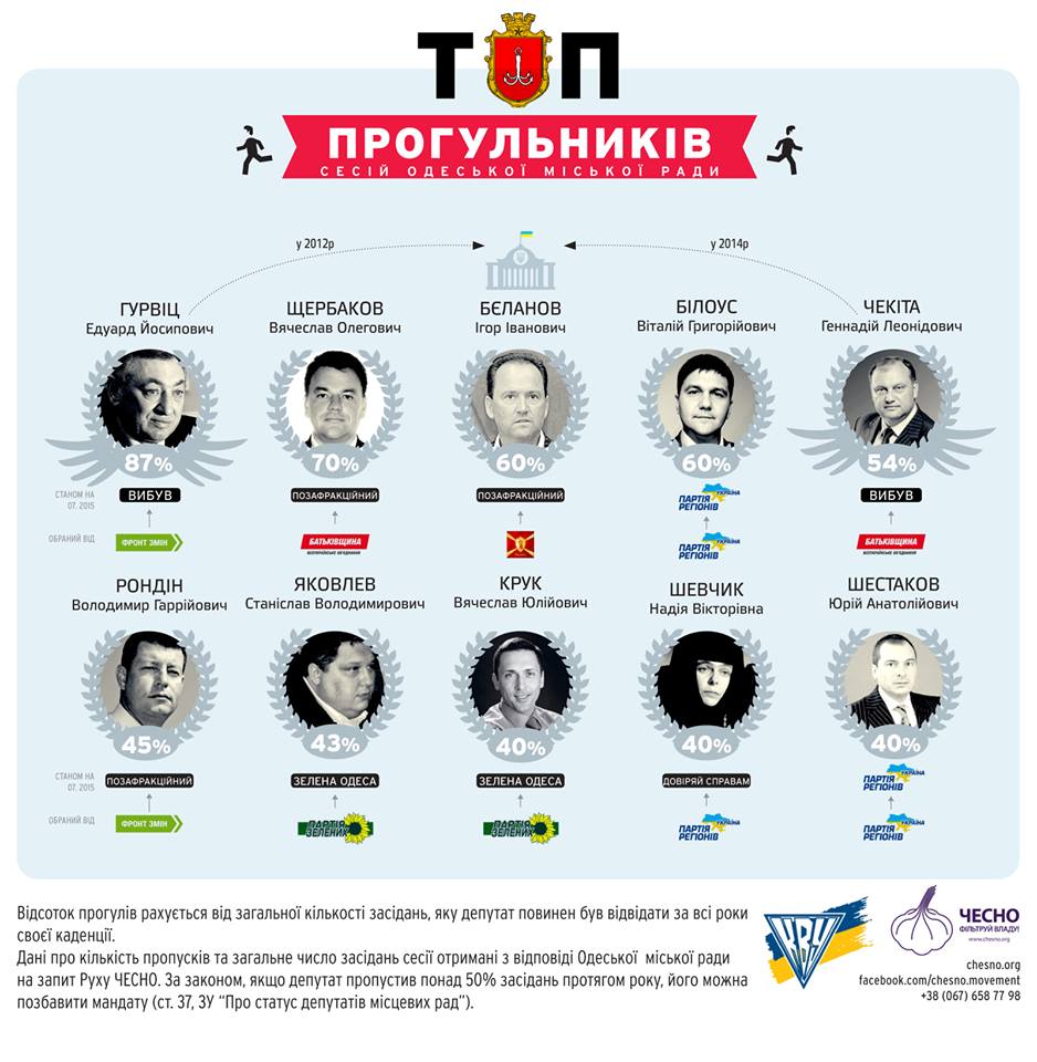 Больше всех заседания прогуливал бывший мэр Одессы Эдуард Гурвиц, который объяснил свои пропуски «принципиальным несогласием с позицией власти». На втором месте — прогулявший 69% сессий депутат Вячеслав Щербаков. Замыкает тройку известный футболист Игорь Беланов, который заявил, что «нажимать на кнопочки — это не для него» и при этом прогулял 59,5% заседаний. Далее по списку идут депутат от «Партии регионов» Виталий Белоус (59,5%) и ныне нардеп Геннадий Чекита (54%).