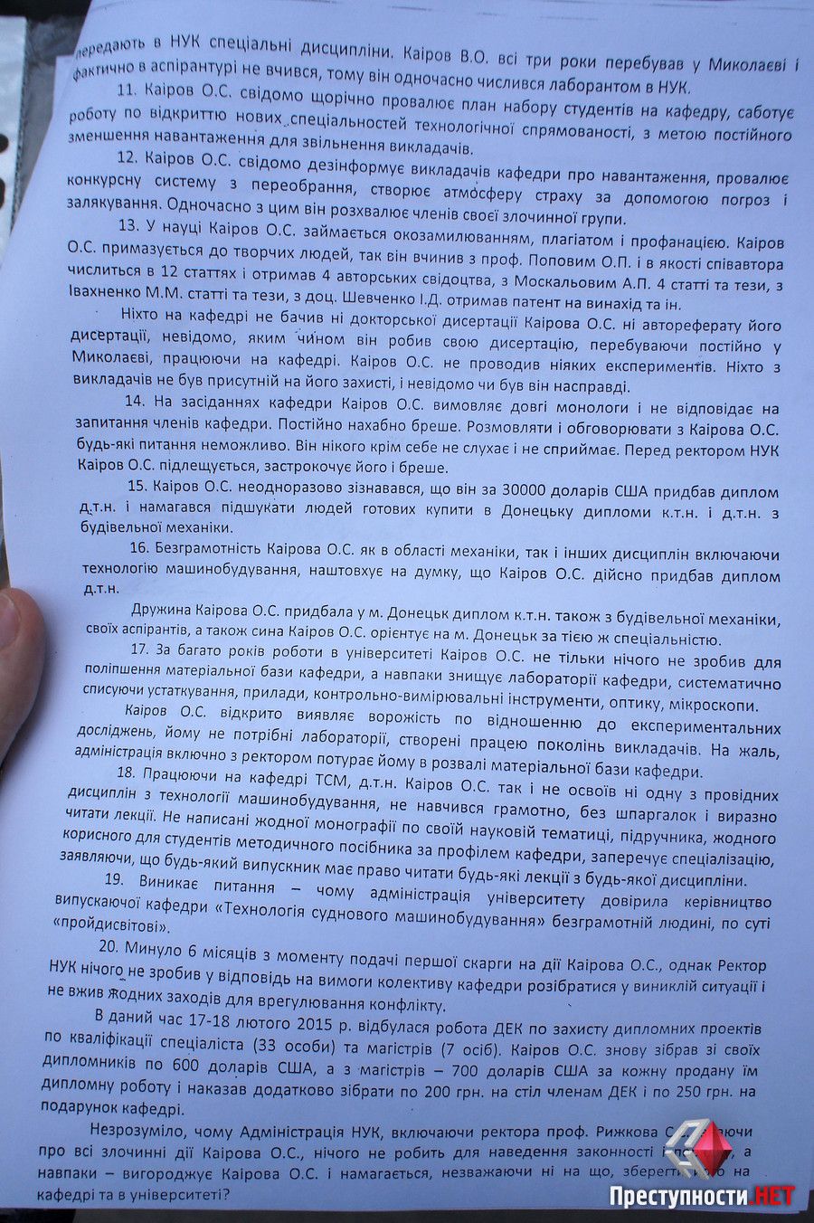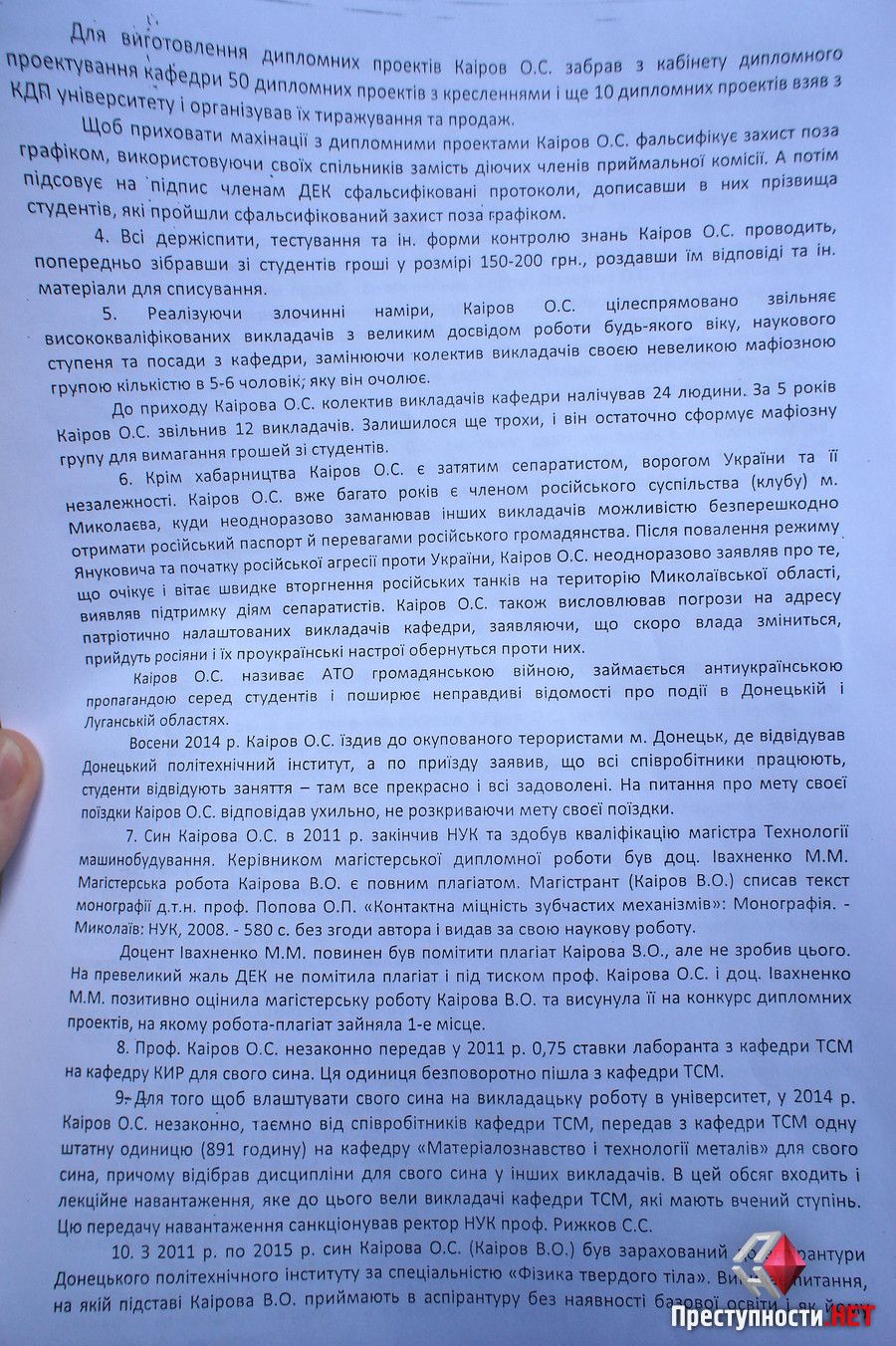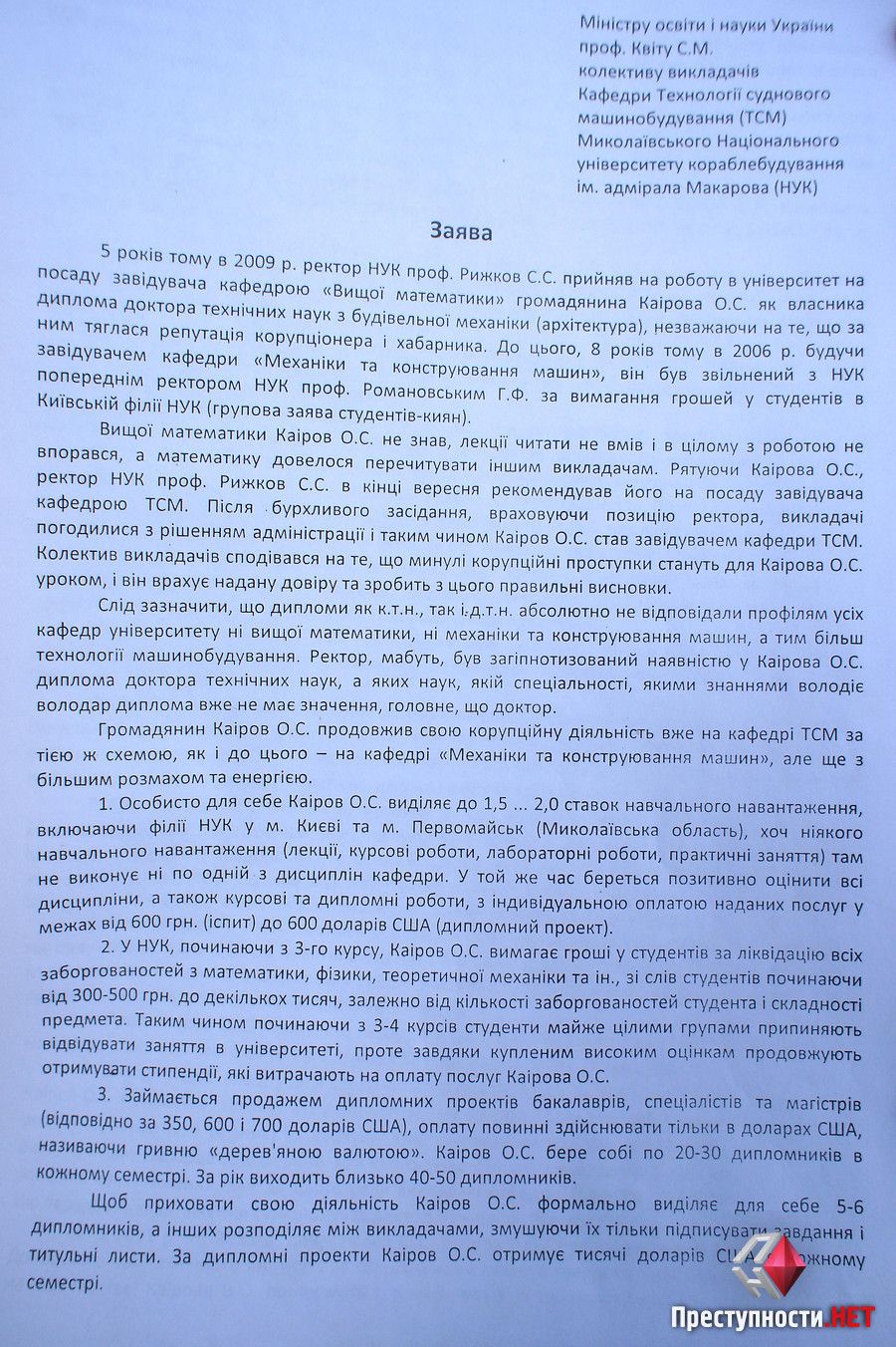Так, сотрудники кафедры во главе с ее доцентом Анатолием Москалевым утверждают, что Алексей Каиров, будучи заведующим кафедры технологий судового машиностроения, систематически вымогает у студентов большие деньги за сдачу дипломных работ, экзаменов и задолженностей. Как указано в заявлении, за диплом бакалавра Каиров берет 300 долларов США, специалиста – 600 долларов, а магистра – 700-750 долларов.