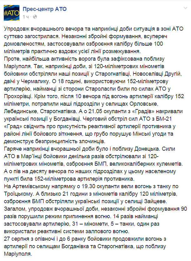 Об этом по состоянию на утро четверга, 27 августа, информирует на своей странице в Facebook пресс-центр АТО.