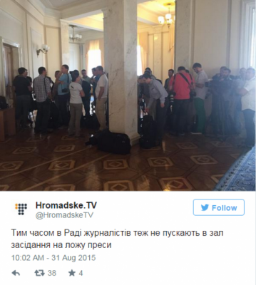 "Пока не известно, по каким причинам и по чьему приказу закрыли зал парламента и нас в нем", — писал Мосийчук.