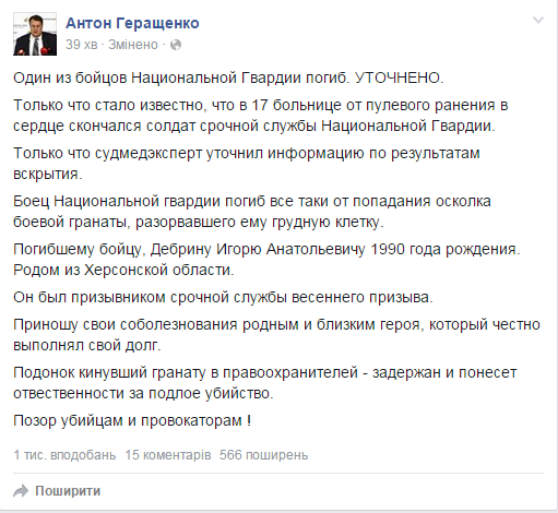 "Боец Национальной гвардии погиб все таки от попадания осколка боевой гранаты, разорвавшего ему грудную клетку", — написал в Фейсбуке Антон Геращенко.