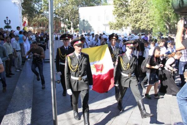 Сегодня, 2 сентября, возле здания Одесской мэрии на Думской площади в честь 221-й годовщины со дня основания города Одессы и 600-летия первого письменного упоминания о порте Кочубей рота почетного караула торжественно подняла флаг города.