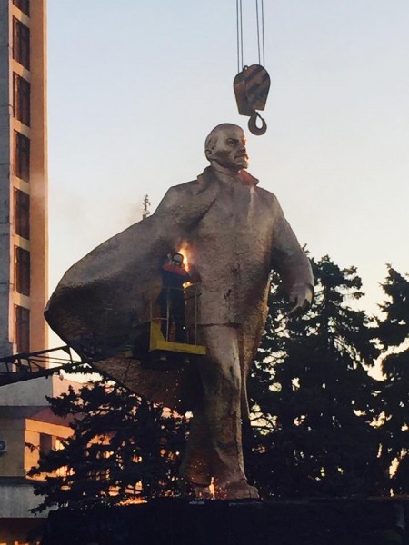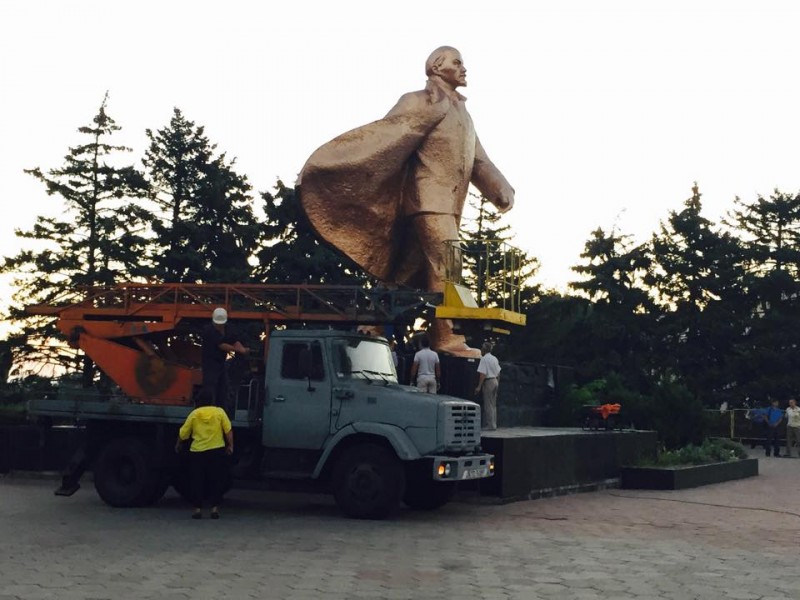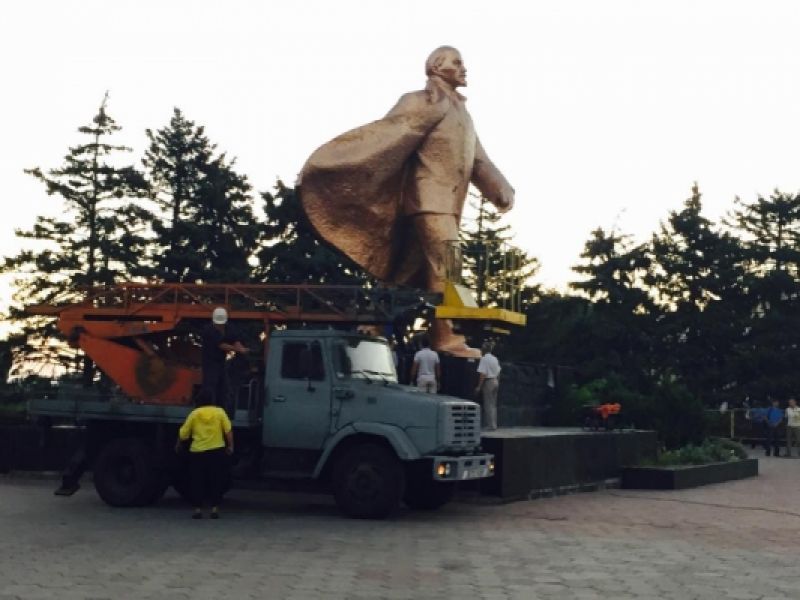 По ее словам, демонтаж памятника начался с 06:00 утра. Так, рабочие с помощью подъемного крана подняли бронзовую фигуру Ильича и сломали постамент.