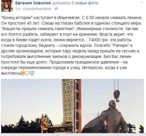 Простоявший в Ильичевске 45 лет памятник Владимиру Ленину сегодня, 3 сентября, демонтировали.