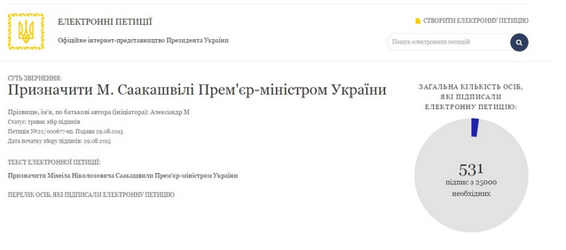 Интересно, что инициатор одной из петиций предложил сделать Саакашвили также и президентом страны. "Саакашвили является очень опытным в борьбе с кровожадным Путиным и Россией. Прошу вас назначить Саакашвили президентом Украины для того, чтобы он победил врага на востоке нашей великой страны!" – написал инициатор петиции, некий Андрей Иванов. Эту идею поддержали 46 человек из необходимых 25-ти тысяч.