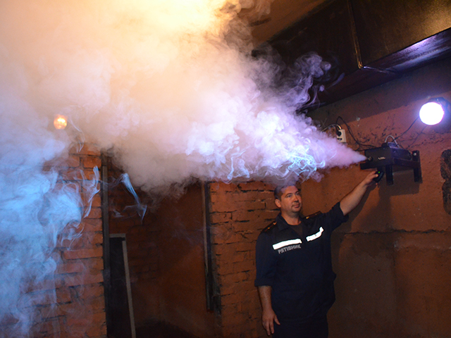 Надев боевую одежду и дыхательный аппарат, руководитель зашел в дымокамеру и проверил новейшие и усовершенствованные элементы – звуковые эффекты, работу генераторов дыма, акустическую систему и прочее.