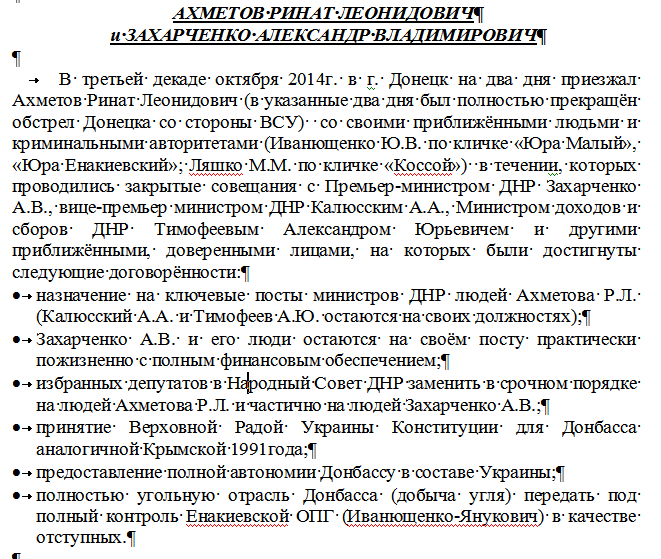 · "избранных депутатов в Народный Совет ДНР заменить в срочном порядке на людей Ахметова Р.Л. и частично на людей Захарченко А.В.;