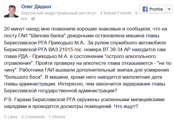 Однако как сообщили журналистам в Бериславской РГА, Приходько был трезв. Его остановили на посту ГАИ по требованию общественника около 2-х ночи.