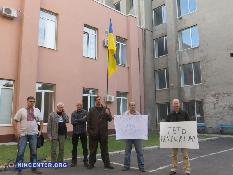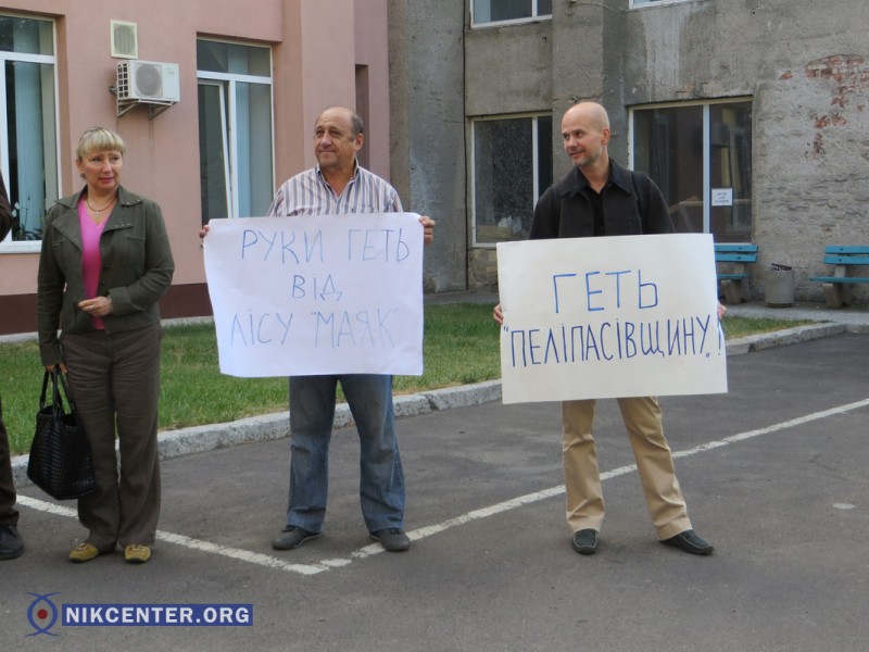 Следует отметить, что судебное заседание началось с пикета николаевской общественности. В акции протеста участвовали около 10 человек. Активисты вооружились плакатами «Руки прочь от леса «Маяк» и «Долой пелипасовщину».