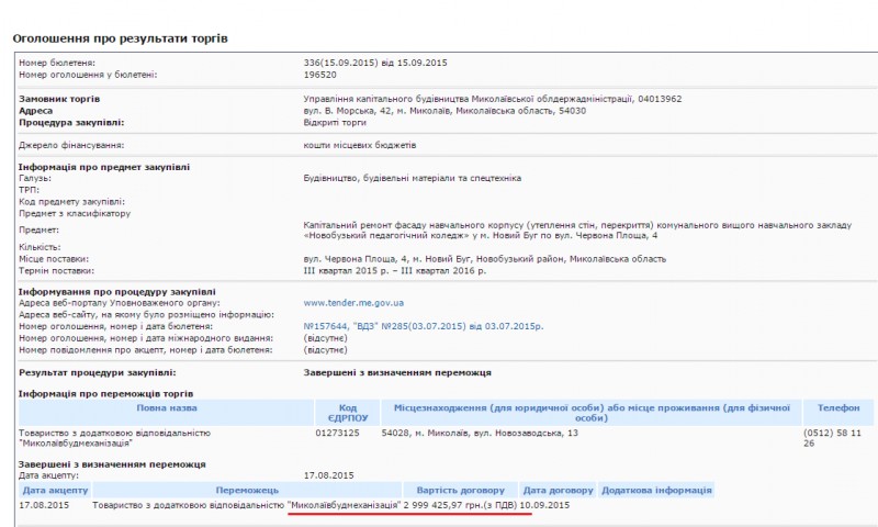 Управление капитального строительства Николаевской ОГА заказало капитальный ремонт фасада учебного корпуса коммунального высшего учебного заведения «Новобугского педагогического колледжа» почти на 3 млн гривен.