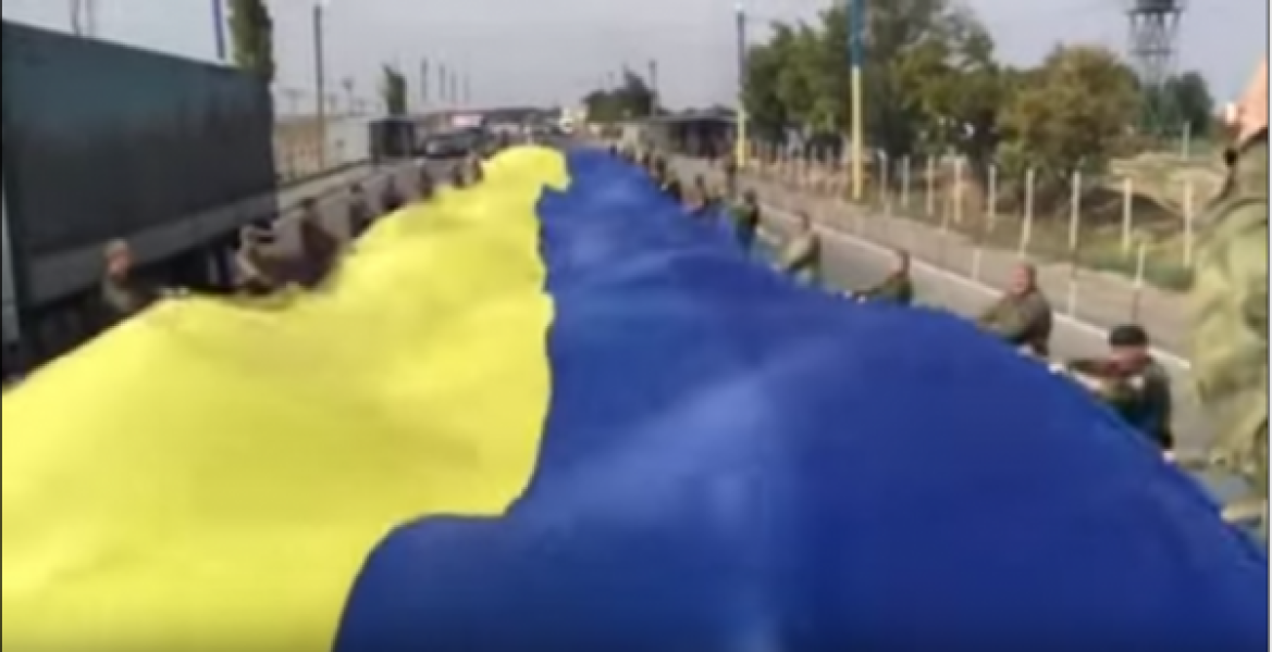 Участники продуктовой блокады Крыма в среду развернули огромный флаг Украины на административной границе с полуостровом.