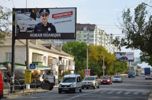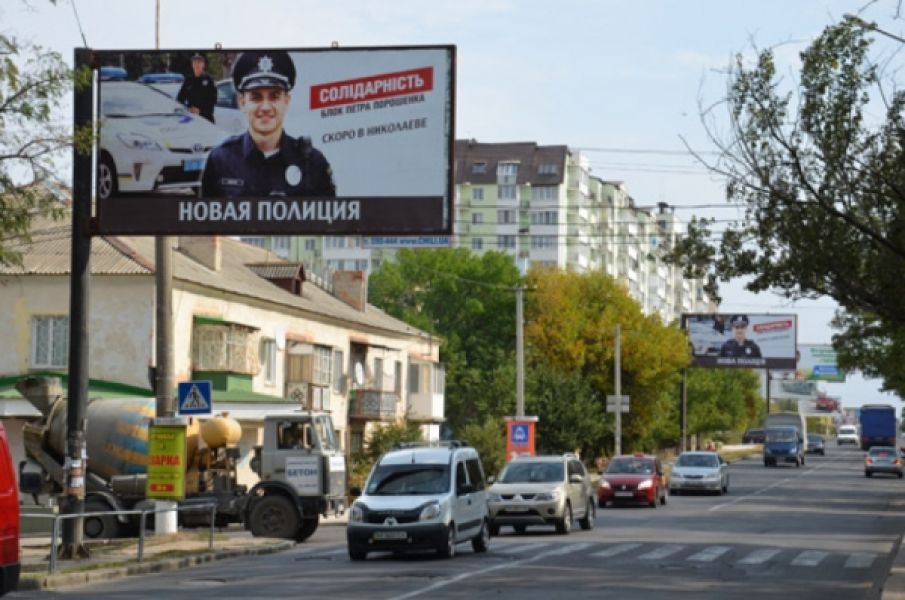 В городе Николаеве появились билборды, на которых политическая партия, вещая о своей деятельности, использовала изображение полицейского — представителя новосозданного подразделения в Украине «Патрульной полиции».
