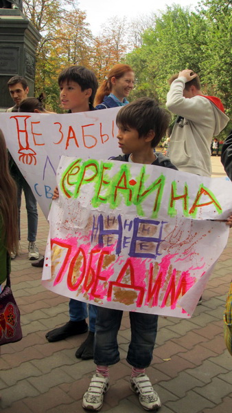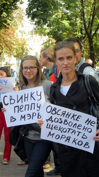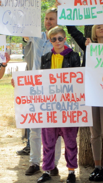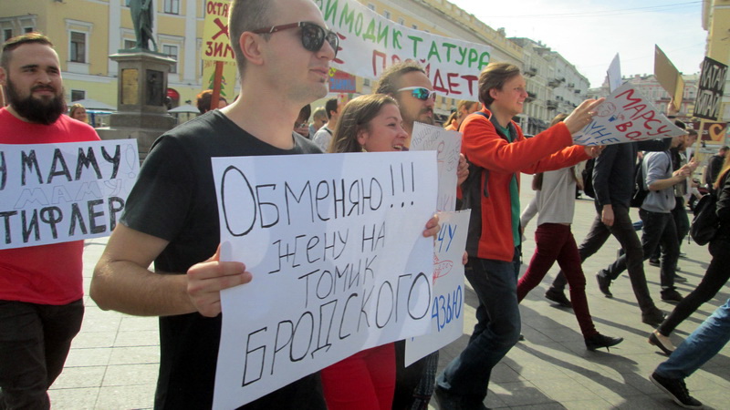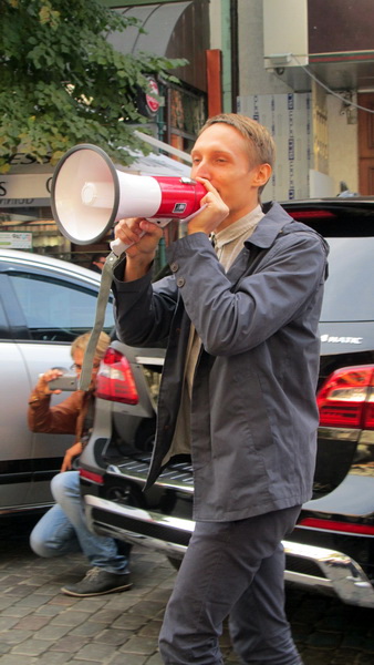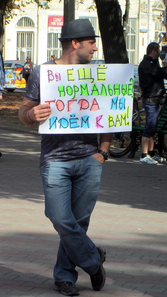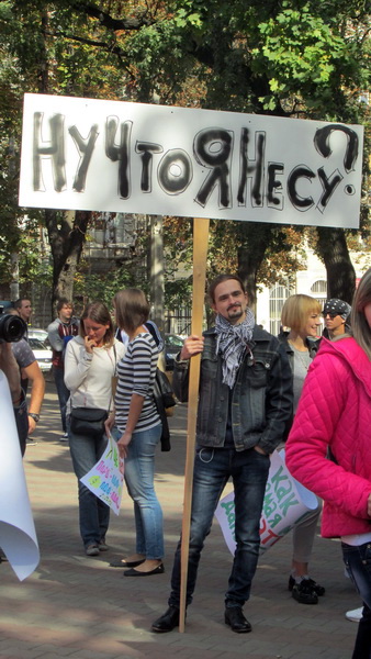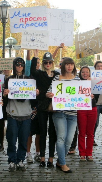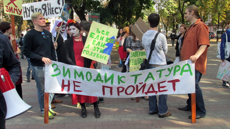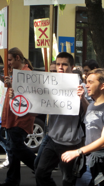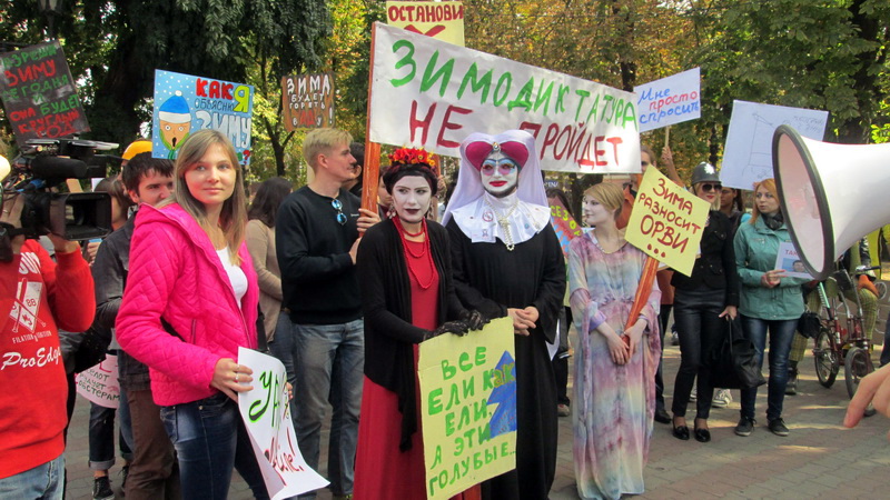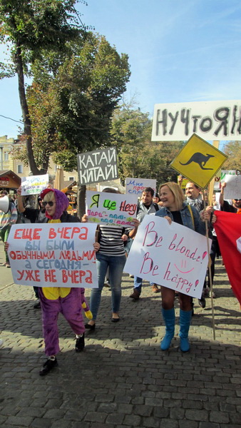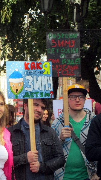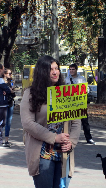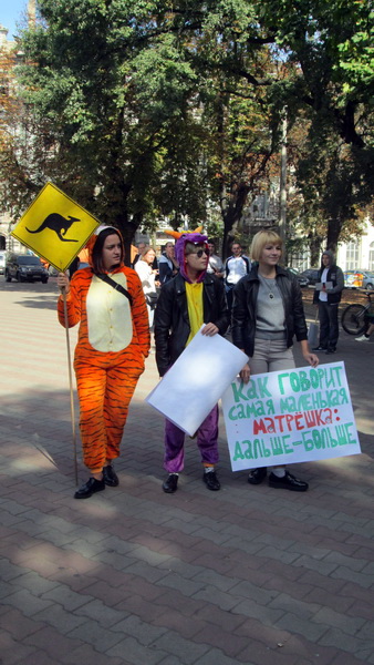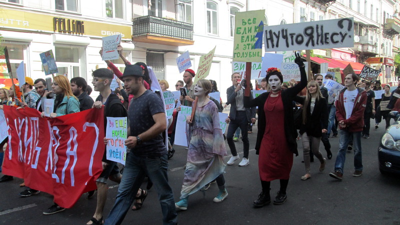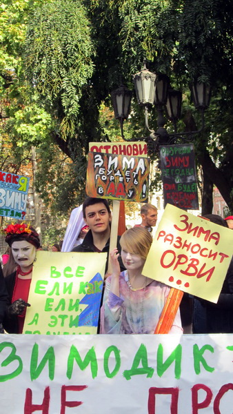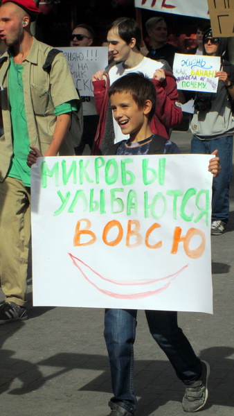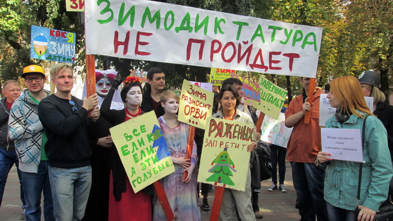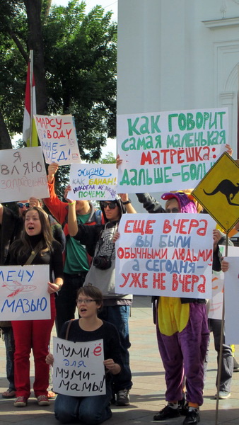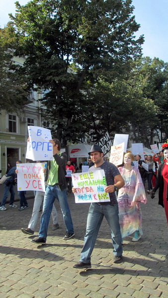 Около 100 молодых людей с транспарантами абсурдного и нелогичного содержания прошли по центральным улицам города. Участники акции выкрикивали лозунги; «Молоко! Творог! Сметана!», «Узкие не пройдут!», «Верните чизбургеры по старым ценам!» и прочие фразы, выдуманные на ходу, чем изрядно веселили прохожих.