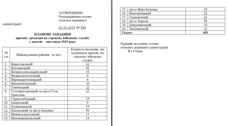 Об этом сообщается в распоряжении председателя Херсонской ОГА «Об определении плановых показателей призыва граждан Украины на срочную военную службу в октябре — ноябре 2015».