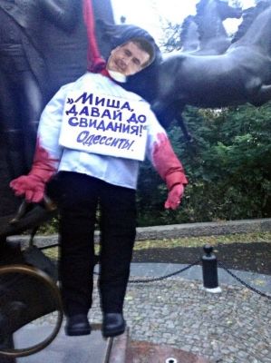 На чучеле висит табличка с надписью: «Саакашвили, давай до свидания!», а внизу подпись: «Одесситы».