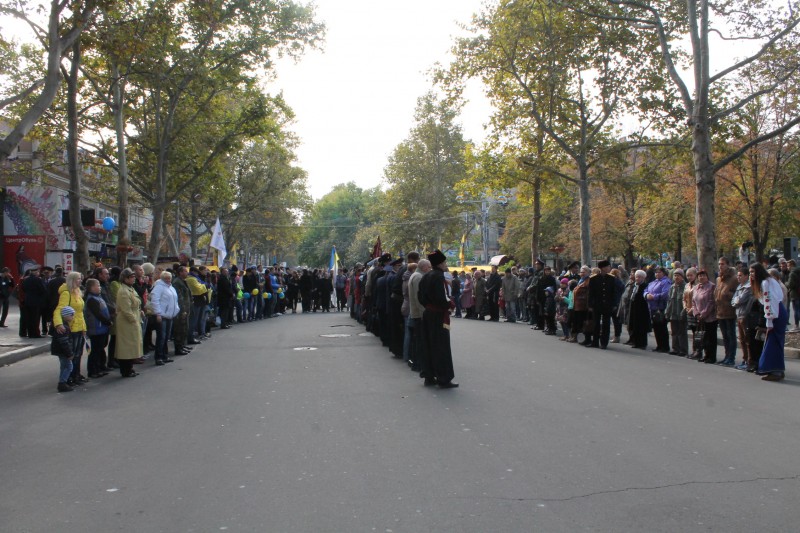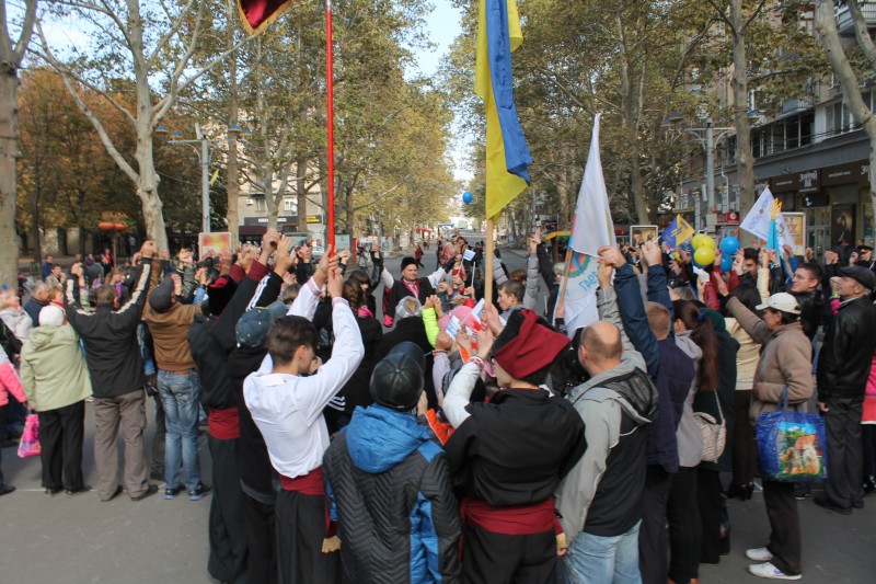 В среду, 14 октября, горожане вместе с представителями николаевского казачества в честь Дня защитника Украины возле Каштанового сквера провели патриотический флеш-моб.