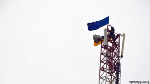 Как сообщает корреспондент Крым.Реалии, двое активистов взобрались на уже не работающую вышку одного из украинских мобильных операторов, которая покрывала, в том числе, территорию Крыма, и установили на вершине два флага.