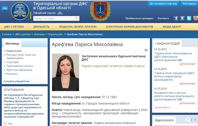 13 октября сотрудниками Генпрокуратуры и СБУ была задержана на взятке в 50 тысяч долларов заместитель начальника Одесской таможни Лариса Арефеева.