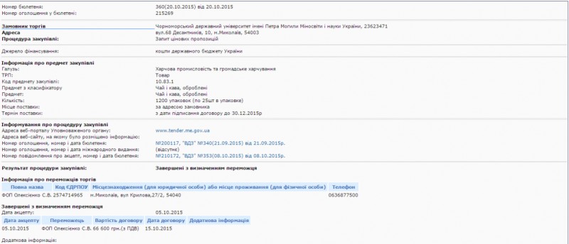 Черноморский государственный университет им. П. Могилы провел тендер на закупку 1200 упаковок растворимого кофе на сумму 66 тыс. 600 гривен.