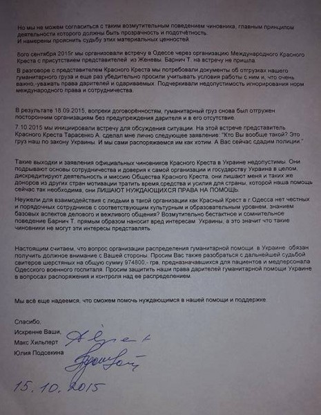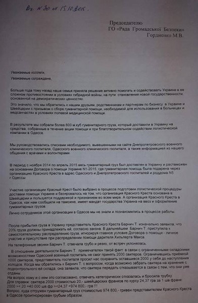 В октябре швейцарские волонтеры и дарители отметили, что из всего груза стоимостью десятки миллионов гривен им удалось вырвать из лап «Красного Креста» 1200 шерстяных свитеров, из которых 500 шт. было передано волонтерам «РГБ», а 700 шт. — представителю волонтерской группы «Південь» Ксюше Алексеевой. Примечательно, что изначально только шерстяных свитеров согласно договора о помощи № 1-2015 было 20 000 шт. Из них в одесский госпиталь попало 1 000 шт, вышеуказанным волонтерским организациям — 1 200 шт. А остальные, согласно нескольким отпискам одесского «КК», могли попасть куда угодно.