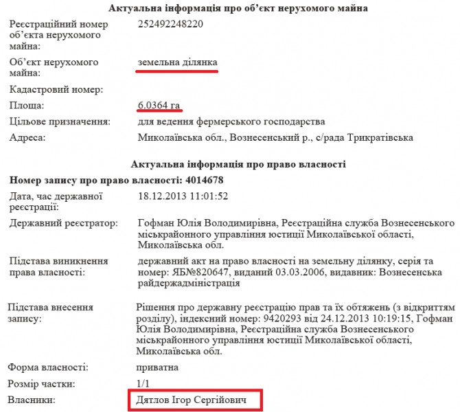 Кроме этого, в Вознесенском районе у Дятлова есть собственный земельный участок для ведения фермерского хозяйства площадью 6,0364 гектар.