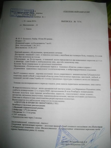 А вот жертвам побоища пришлось провести долгое время в больнице. Они стали инвалидами и потеряли работу. Жена нападавшего в следствие открытого пролома черепа Татьяна похудела на 20 килограммов, сейчас у нее начались проблемы со зрением, слухом и памятью. А у дочери Юлии были две открытые черепно-мозговые травмы и осколочный перелом свода черепа. Теперь у нее бессонница и головокружения. С такими открытыми ранами в голове ей нельзя даже выходить на улицу.