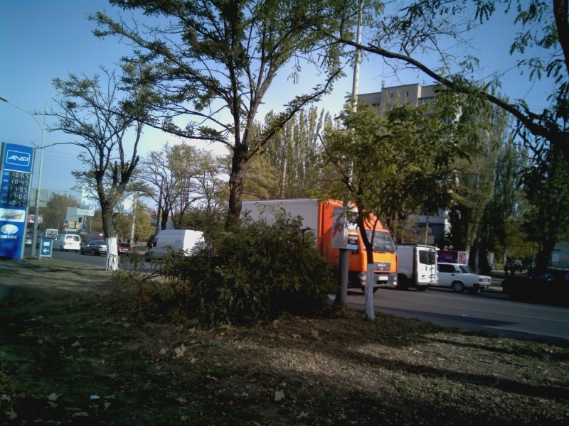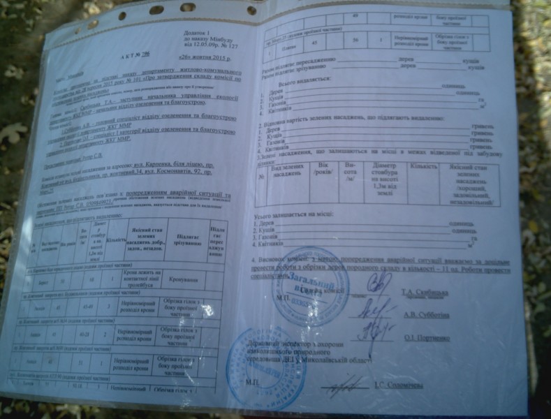 Обнаружилось это сегодня, 2 ноября, во время обрезки совершенно нормальных деревьев на пересечении пр. Октябрьского и ул. Строителей. По просьбе журналиста НЦЖР рабочие предъявили акт, в котором причина сноса деревьев по адресам: пр. Октябрьский угол ул. Строителей, пр. Октябрьский, №№ 34, 90, ул. Космонавтов, 92, пр. Мира, 25 и ул. Карпенко (возле юридического лицея) – указывалась как «предупреждение аварийной ситуации». Всего должны быть обрезаны 11 здоровых деревьев, возраст которых превышает 40 лет. Работы проводила частная фирма «Укрбиорост».