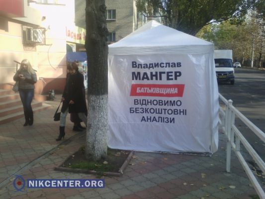 Если Владимир Миколаенко еще не проводит никаких агитационных мероприятий, то палатки Владислава Мангера уже появились на улицах Херсона. Причем, кандидат от «Батькивщины» продолжает использовать те же лозунги, за которые был высмеян в соцсетях во время первого тура выборов: в частности, обещает возобновить бесплатные анализы.