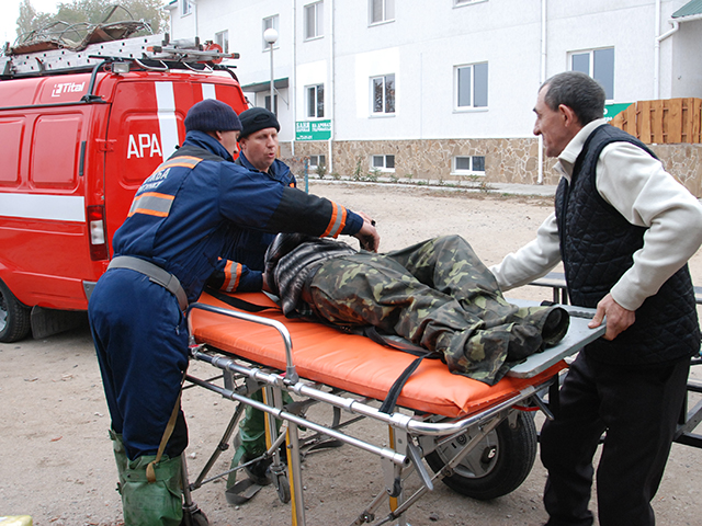 Спасатели на надувной лодке добрались по воде к пострадавшему, уложили, закрепили его на носилках и доставили в карету скорой медицинской помощи.