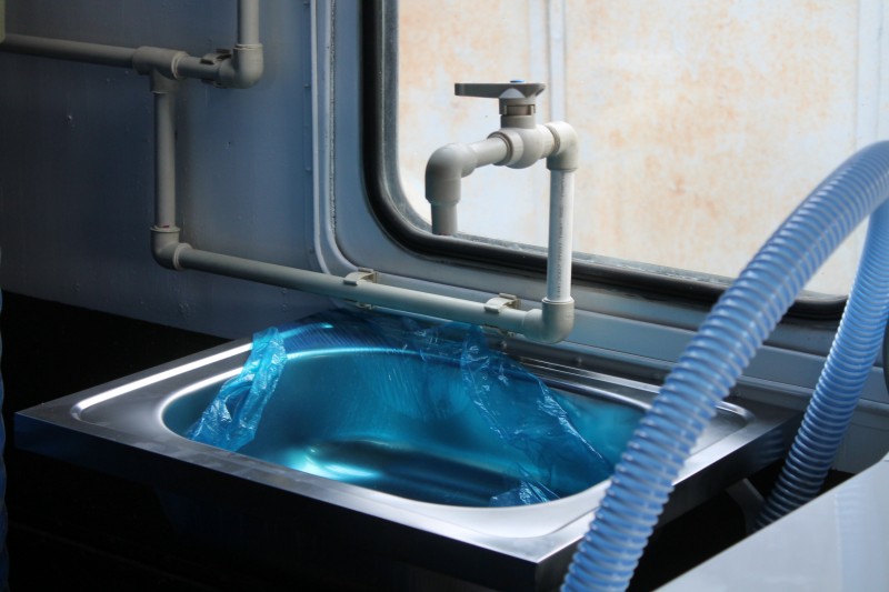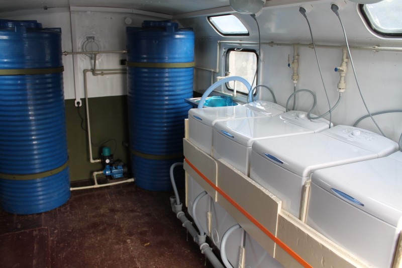 КУНГ оснащен четырьмя стиральными машинами, емкостями для воды, кухонной мойкой и буржуйкой.