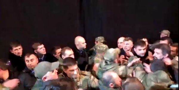Перед тем активисты пытались выйти на сцену, чтобы выразить протест в связи с, по их мнению, фальсификациями во время проведения общественных слушаний.