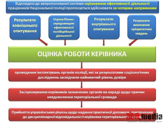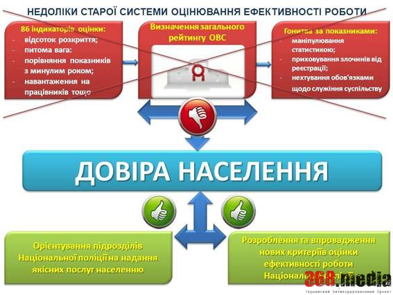 Арсен Аваков отметил, что будет внедрена абсолютно новая модель оценки эффективности работы, которая опирается на доверие населения к полиции. По его словам, контроль работы правоохранителей будет осуществляется по четырем направлениям: