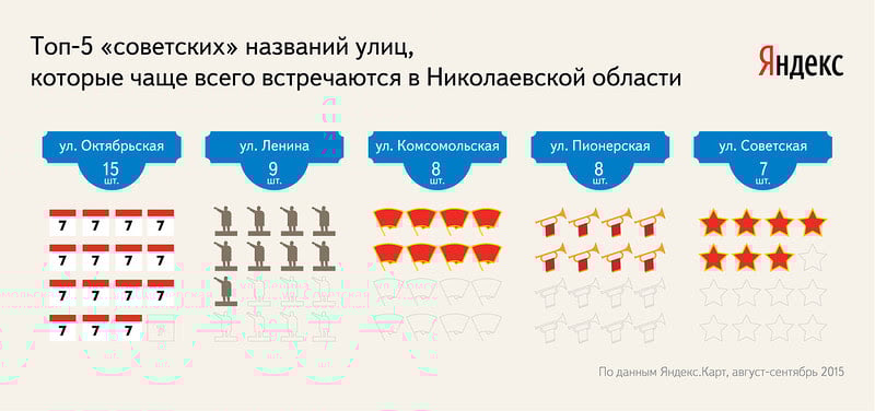 Самое популярное среди названий улиц в этом регионе – улица Октябрьская. А вот как выглядит топ-5 «советских» наименований в населенных пунктах Николаевщины: